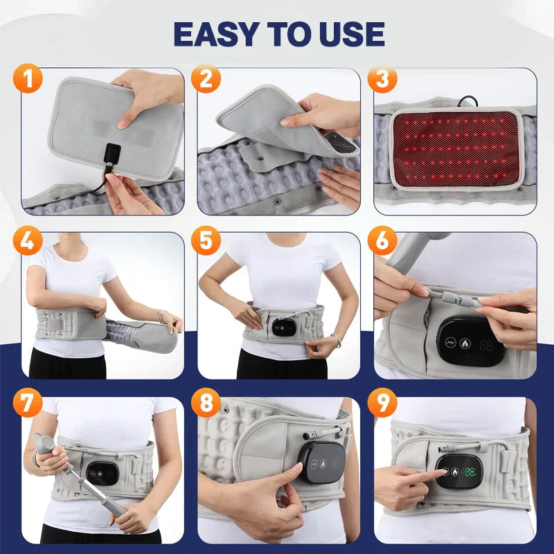 La ceinture lombaire chauffante à lumière rouge est conçue pour offrir une chaleur ciblée et un massage doux du bas du dos. Elle intègre un chauffage infrarouge, des vibrations et une compression d'air réglable pour favoriser le confort, la relaxation et une posture saine, que vous soyez à la maison, au travail ou en déplacement.
