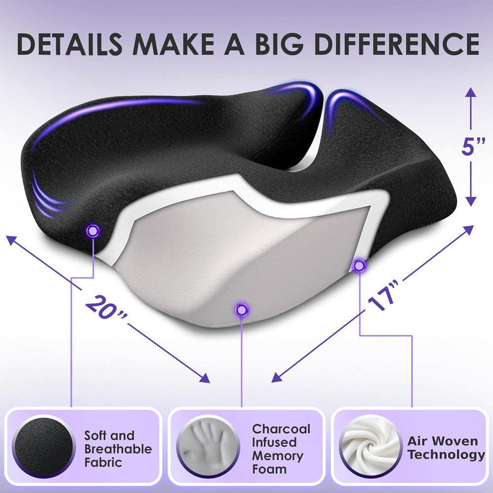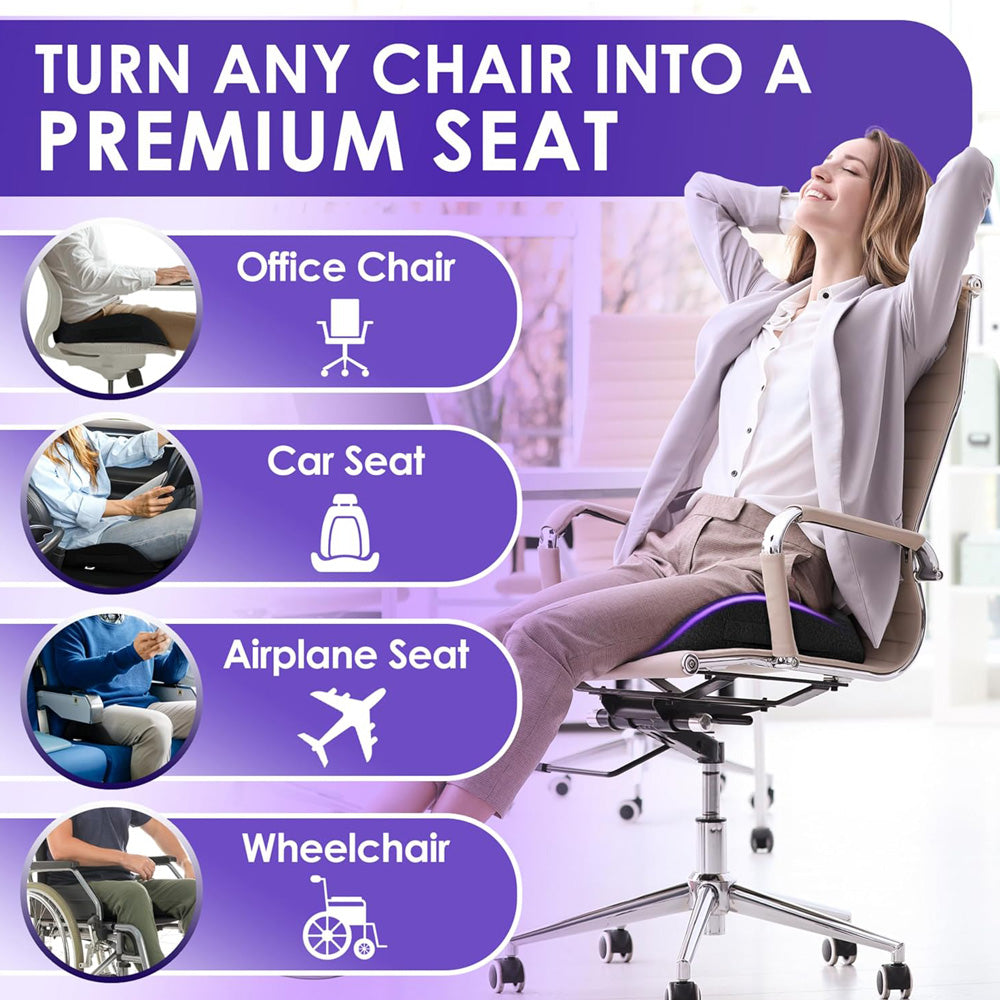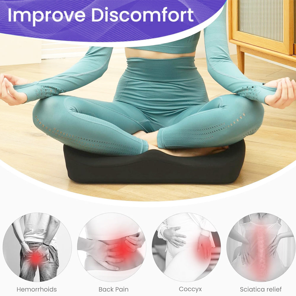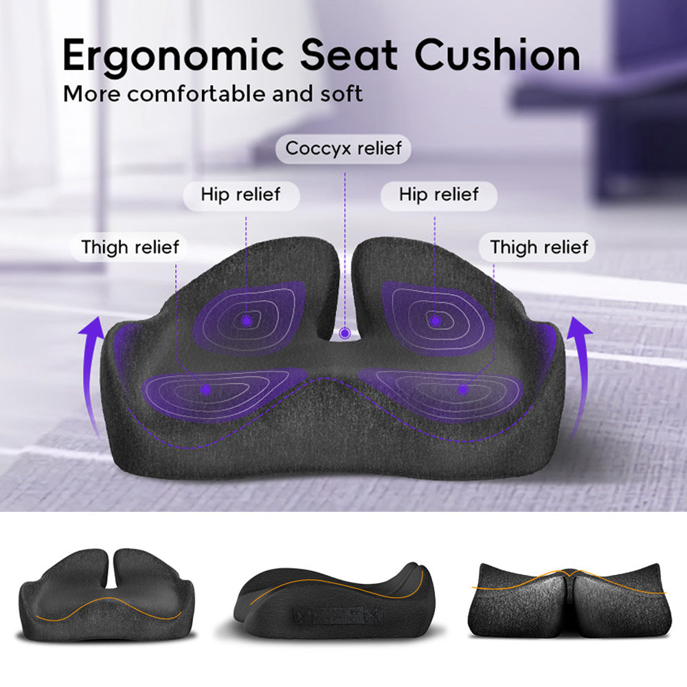 Réduit la pression et améliore instantanément le confort. Conçu par des experts en ergonomie pour un soulagement immédiat après une position assise prolongée. Répartit uniformément la pression, soutient le coccyx et le bas du dos, réduisant ainsi la douleur et améliorant la posture dès la première utilisation.