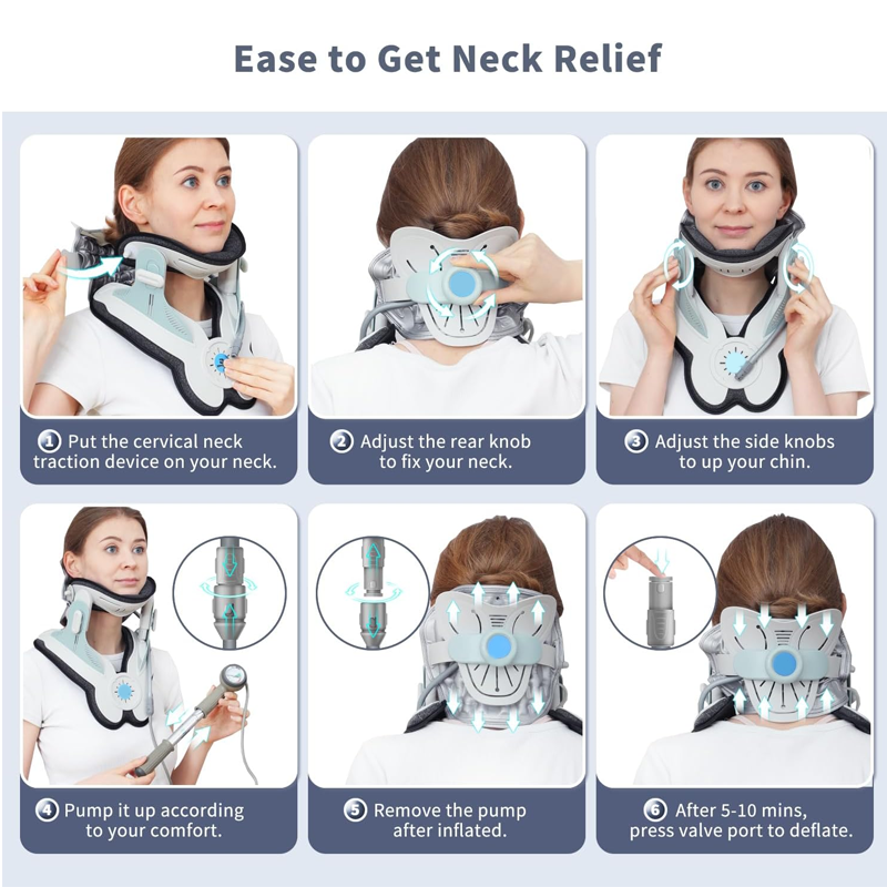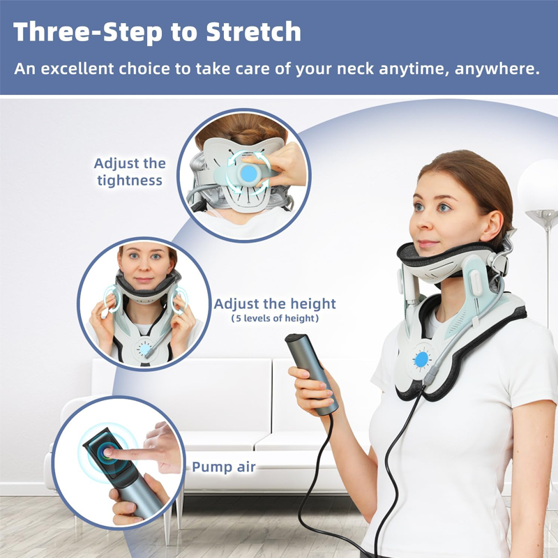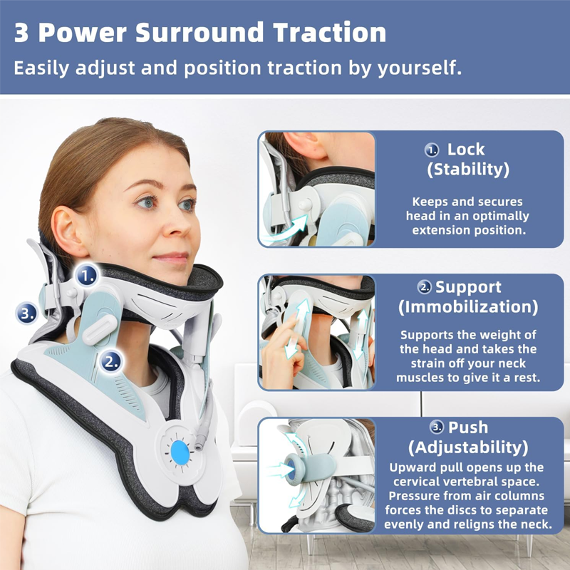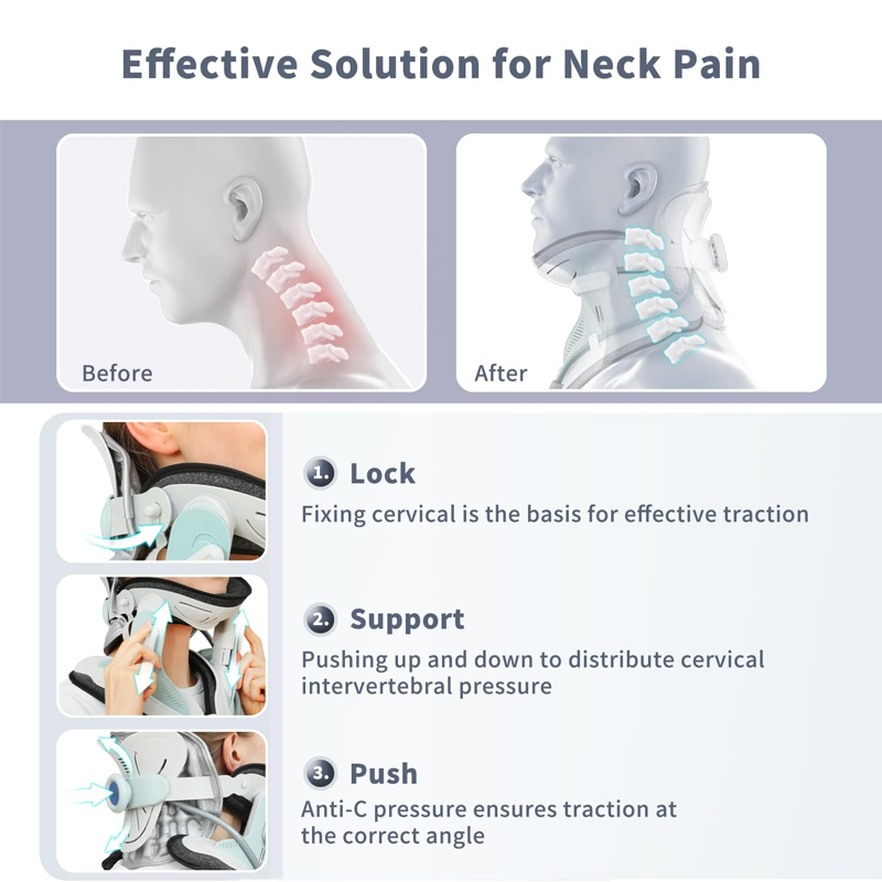 Grâce à un support d'airbag à 8 points et à la technologie de traction Triple-R, cet appareil décompresse votre cou, permettant aux muscles tendus de se détendre et aux nerfs enflammés de se libérer. Une utilisation régulière aide à soulager la douleur, la raideur et la bosse cervicale frustrante due à une mauvaise posture ou à une position assise prolongée.